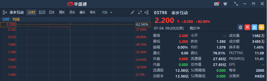 智通财经APP获悉,家乡互动(03798)首日挂牌,截至9时20分,涨62.96%,报价2.20港元,成交额3493万港元,市值达27.63亿港元。