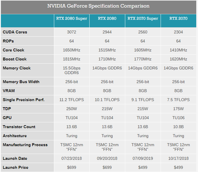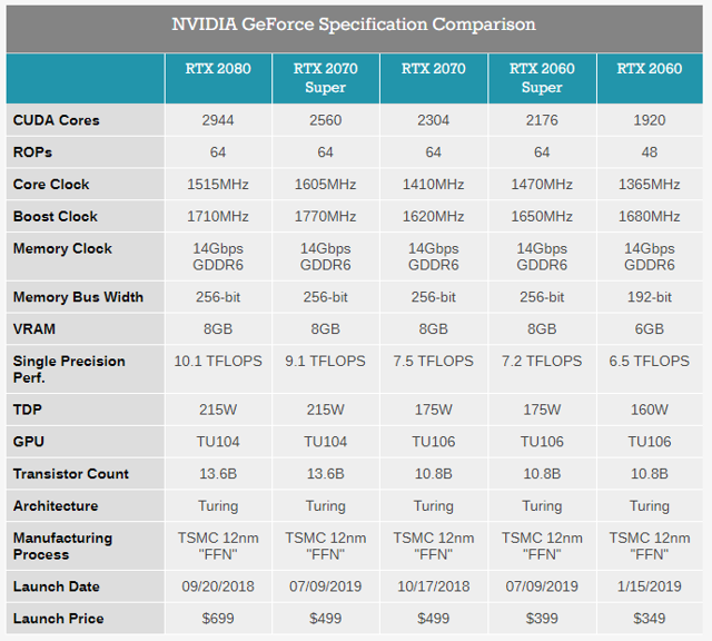 从下图规格信息看,三款超级显卡与原标准版显卡基本一致,除了RTX2060 Super价格从标准版的349美元提至399美元,其他两款超级显卡相比标准卡并未提价,性能提升的情况下,性价比吸引力更突出,十分利好消费者。随着对手AMD新发的多款显卡性能大幅提升,超级显卡的推出能确保公司显卡在同一价位保持性能上的优势,公司多年来也一直被视为高端显卡的代表。