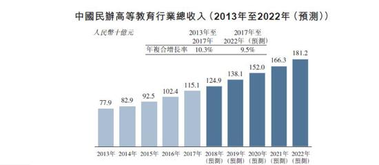 行业增速方面,根据弗若斯特沙利文的测算,中国民办高等教育行业的总收入从2013年779亿上升至2017年1,151亿,年复合增速为10.3%。同时,该机构预测2022年市场规模将增至1,812亿,年复合增速为9.5%。