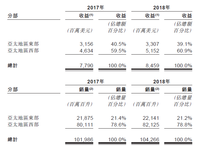按业务分部,公司分两个地理区域进行业务运营:亚太地区东部(澳洲、日本及韩国为主)及亚太地区西部(中国、印度、越南以及向其他亚太地区出口的地区)。2018年,亚太地区东部营收占总营收的39.1%,但销售量(按升计)仅占总销售量的21.2%,表明成熟度越高的市场,偏好更高端的啤酒品牌。