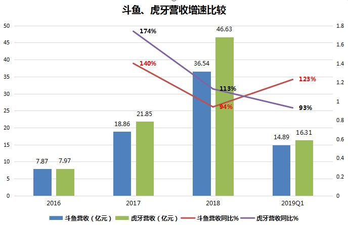 从营收数据上来看,2016年至今虎牙的营收一直高于斗鱼,其中2017年和2018年虎牙的营收同比增速也要比斗鱼更快。不过到了2019年一季度,斗鱼实现营收14.89亿元,同比增长123%,与虎牙的差距有所缩小。不过这里面能看到一个行业的特点,那就是游戏直播仍然保持了超高的增长速度。