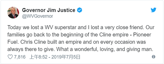西弗吉尼亚州州长Jim Justice7月5日发Twitter上说,该州失去了一位“超级明星”,并且他失去了“一位非常亲密的朋友”。
