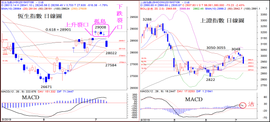 恆生指數上星期連續多天在高位橫行整固之後,今早即以裂口低開,而且跌幅逐步擴大至超過500點。從日線圖看,經過今早的裂口下跌之後,一個「島形轉向」形態正式形成,表示7月4日的29008已成為短期頂部。