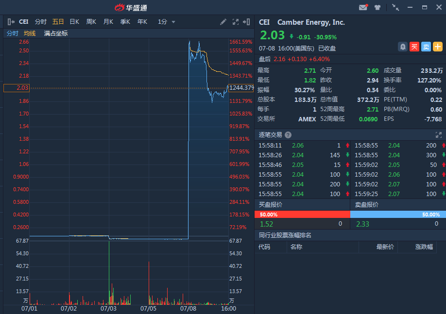 当日开盘,Camber Energy股价高开逾1610%,报2.60美元。