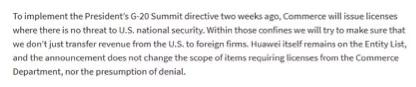 美国商务部官方网站也确认了此事。在该网站刊登的一份发言稿中,美国商务部部长罗斯表示他将给那些“不会对美国国家安全构成威胁”的与华为的生意颁发许可,并称此举是为了落实两周前美国总统特朗普在日本大阪G20峰会上对中方做出的承诺。