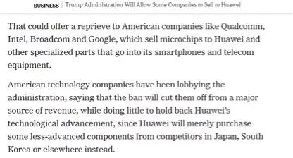 《纽约时报》还表示,美国的科技公司其实一直都在游说特朗普政府,希望放宽对华为的限制,因为这些限制不仅会导致这些美国企业失去一个主要的营收来源,而且也不会阻碍华为的发展,毕竟华为还可以从日本或韩国等美国企业的竞争对手那里购买替代产品。