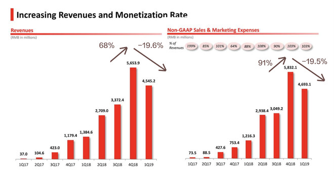 Q 1 财报中可以很明显的看到拼多多的营收金额是随着市场费用的波动而波动的,具有强烈正相关性,去年四季度营收在三季度基础上增长67.7%, 市场营销费用则从30.49亿跳涨到58.3亿,环比增长91%。过去一个季度营收从56.54亿萎缩到45.45亿,环比下跌19.6%,市场费用也从58.32亿,减少到46.93亿,同期减少19.5%。