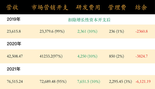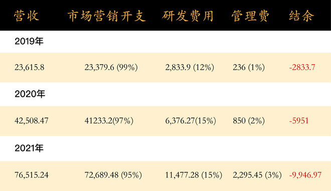我们用比较乐观的模型推演一下未来两年的财务表现。假设今明两年公司会保持80%的营收增长,营销费用通过不断优化,由目前的占比营收103%下降到95%,研发费用提高到15%,管理费占比基本不变。那么将得如下结果(单位人民币百万):