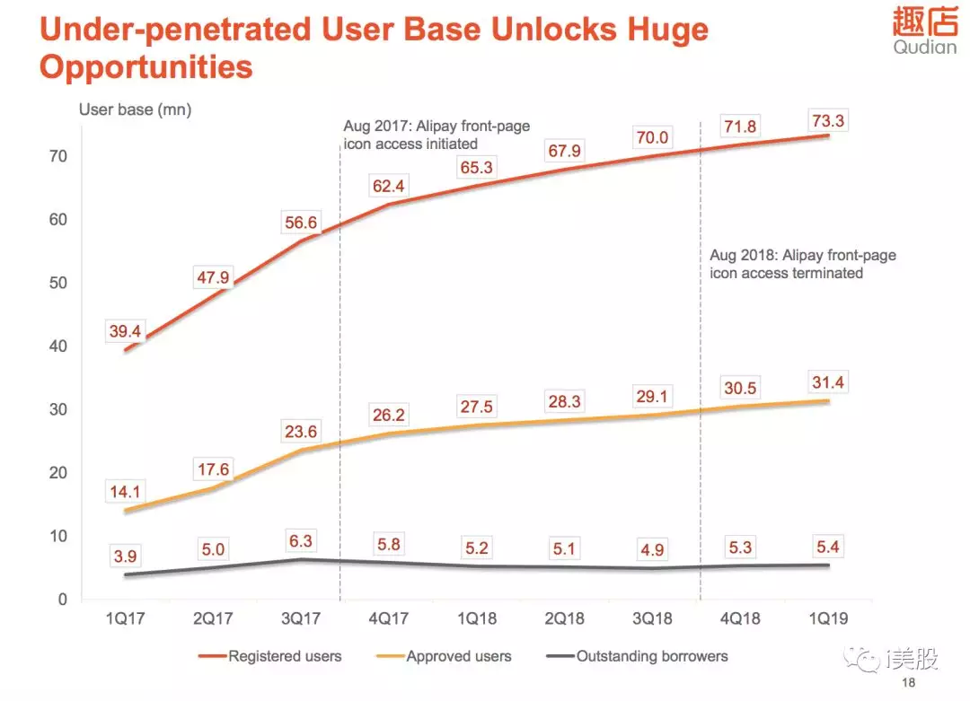 之前在支付宝的流量帮助下,趣店一年内增加了近2000万用户。导流协议在去年8月终止后,用户从7180万增长到截至第一季度的7330万,说明用户自然增长仍在延续。因为趣店服务的群体聚集程度高,收入水平相似,比如餐饮服务员,外卖员活动区域集中,所以口碑相传效果较好,获客成本较低。