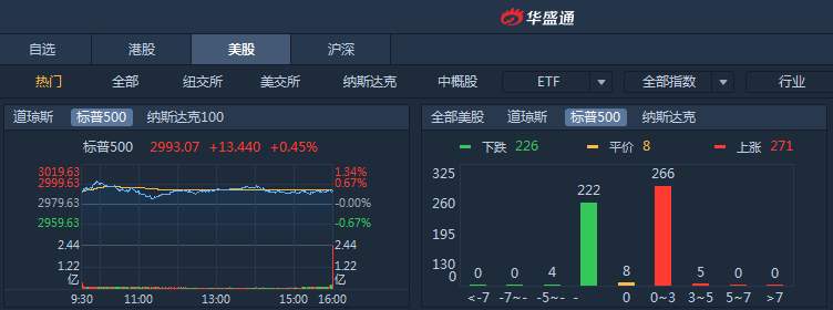 鲍威尔证词放鸽,减息憧憬刺激美股持续上扬,周三美股三大股指盘中一度创下历史新高,标普500指数史上首次突破3000关口。截至收盘,道指涨0.29%报26860.20点;纳指涨0.75%报8202.53点,收创历史新高;标普500指数涨0.45%报2993.07点。