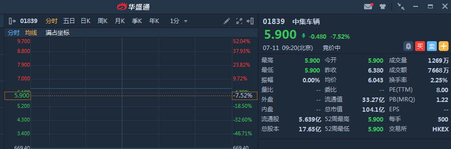 智通财经APP讯,中集车辆(01839)首日挂牌,截至9时20分,跌7.52%,报价5.90港元,成交额7668万,市值达104.1亿港元。