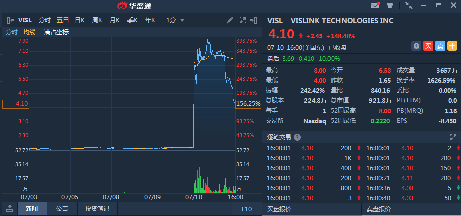 Vislink Technologies是一家美国的高级通讯公司,服务经验长达50余年,美东时间7月11日公司宣布获得美国陆军280万美元的合同,在此消息刺激下,周三早盘股价飙升333.33%。
