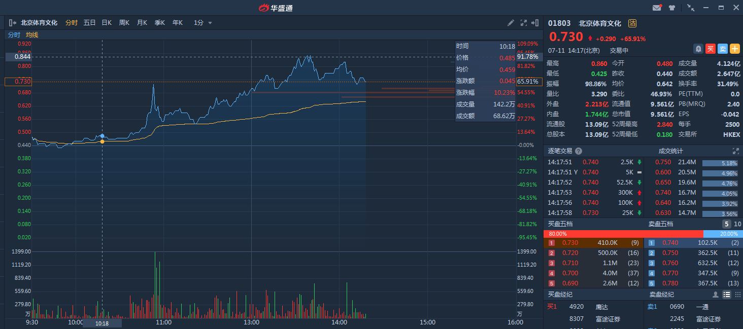 智通财经APP获悉,北京体育文化(01803)近日股价暴跌暴涨,今日午后股价现大幅反弹,一度升逾90%,截至14时18分,涨65.91%,报价0.73港元,成交额2.647亿港元。