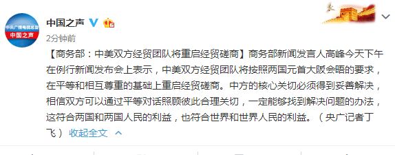 商务部新闻发言人高峰今天下午在例行新闻发布会上表示,中美双方经贸团队将按照两国元首大阪会晤的要求,在平等和相互尊重的基础上重启经贸磋商。中方的核心关切必须得到妥善解决,相信双方可以通过平等对话照顾彼此合理关切,一定能够找到解决问题的办法,这符合两国和两国人民的利益,也符合世界和世界人民的利益。(央广记者丁飞)