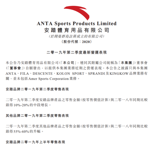 新浪港股讯 7月11日消息,安踏体育7月11日晚间在港交所公告称,上半年安踏品牌产品零售金额同比录得10%-20%的低段增长,其他品牌同比增长60%-65%。