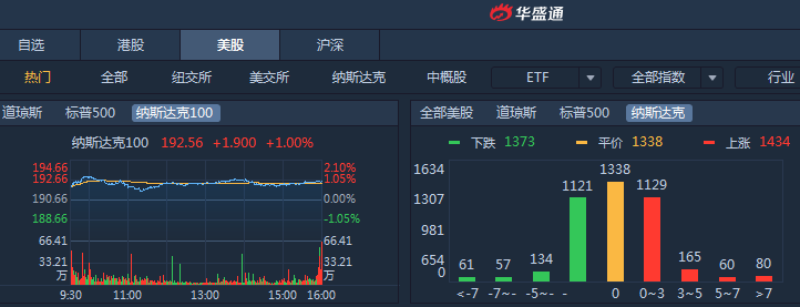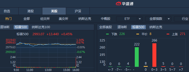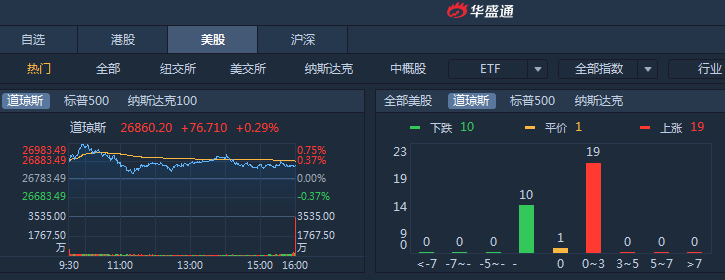 鲍威尔证词放鸽,减息憧憬刺激美股持续上扬,周三三大股指盘中创下历史新高。道指涨0.29%,纳指涨0.75%收创历史新高,标普500指数涨0.45%。
