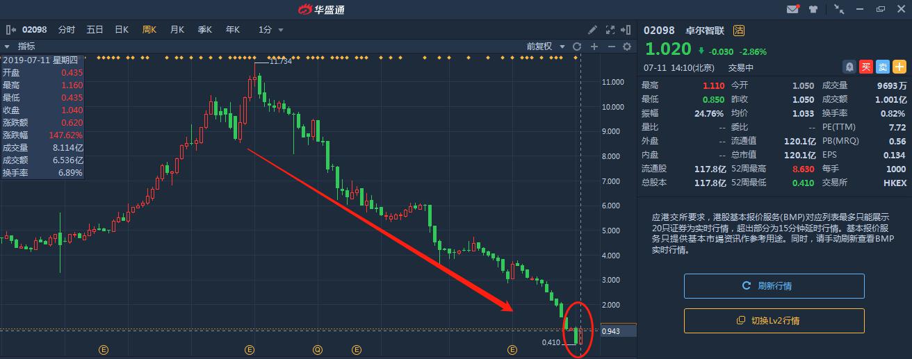 最近港股有一家公司在7月8日到7月10日大涨了140%,引起了众多投资者的关注。这家公司叫卓尔智联,名字听起来颇有科技公司的味道。仔细看这家公司的股价走势,你会发现它在2018年4月曾经最高价达11.76港元,市值超过1300亿,但目前只剩百亿左右。显然即使是近几日的大涨,与卓尔智联往日的荣光相比,也显得杯水车薪。