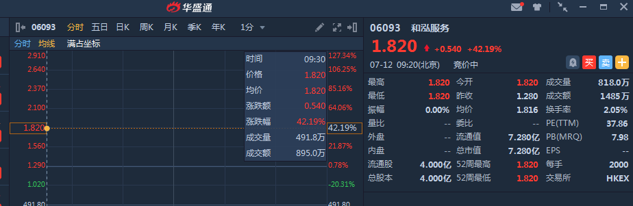 和泓服务(06093)首日挂牌,截至9时20分,高开42.19%,报价1.82港元。成交额1485万,市值7.28亿港元。