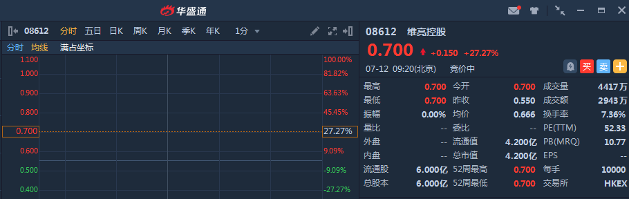 维亮控股(08612)首日挂牌,截至9时20分,高开27.27%,报价0.7港元。成交额2943万,市值4.2亿港元。