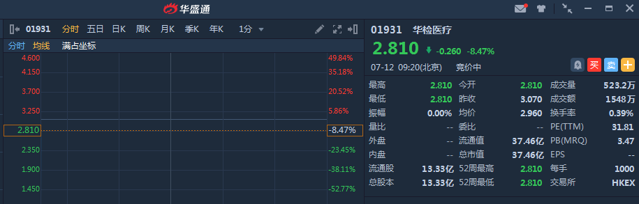 华检医疗(01931)首日挂牌,截至9时20分,低开8.47%,报价2.81港元。成交额1548万,市值37.46亿港元。