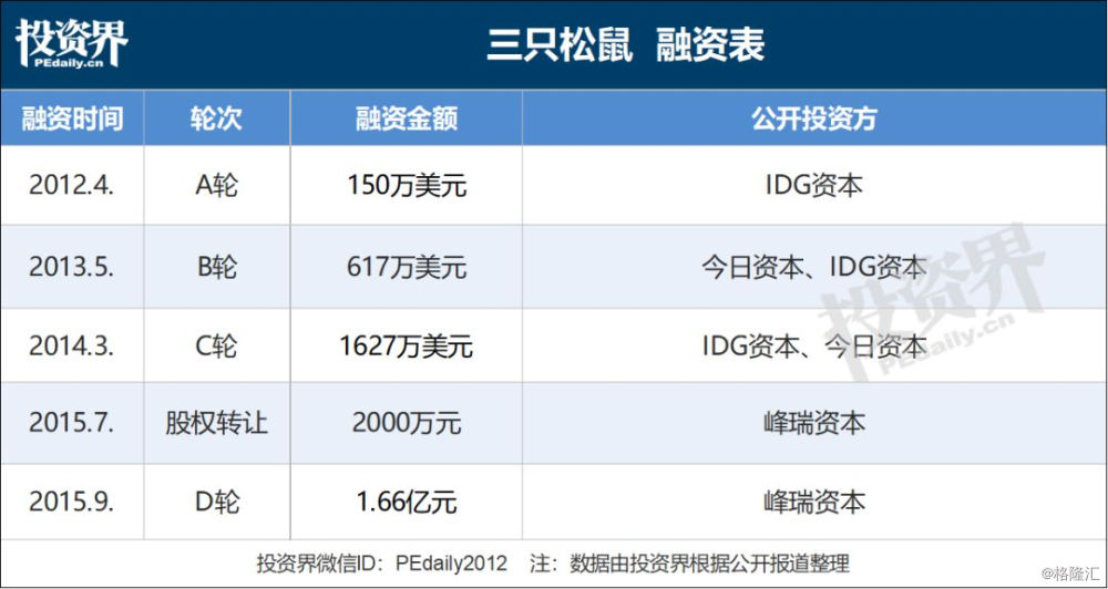 最初,IDG资本投资A轮150万美元,估值超500万美元;2013年5月,今日资本和IDG联合投资B轮617万美元,估值翻了6倍;2014年4月,两家联合再投C轮1627万美元,估值1.36亿美元。2015年9月,三只松鼠获峰瑞资本1.66亿元D轮投资。另外,章燎源还出让了0.57%的老股给峰瑞资本,价格是2000万元。