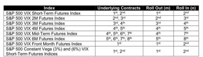 这些指数都是用两个月或几个月的期货合约构成底层资产,不断买进远的,卖出近的,保证总体持仓总是约等于一个固定期限。例外的是VIX Front Month Futures Index,这个指数是只持有最近月的合约,直到到期前3天,再切换到下个临近月份的合约。
