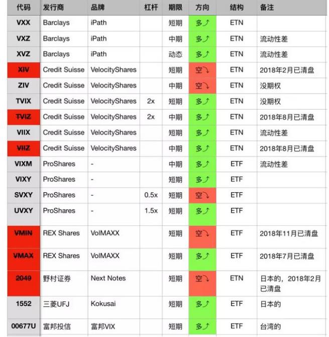 除VXX外,还有很多对标VIX期货指数的ETP产品,有短期的、中期的、有反向的,还有加杠杆的。这里罗列了一个清单,它们中的一些已经不复存在了,但是本着考古博学的精神,还是列出来让大家见识见识: