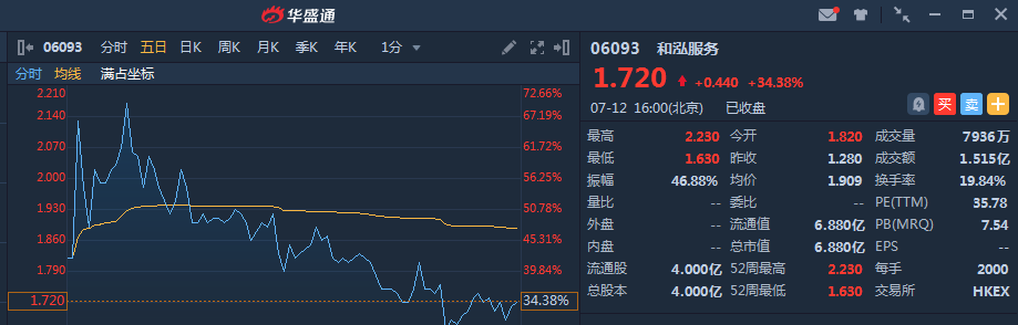 和泓服务(06093)首日挂牌港交所,开盘涨42.19%。截止收盘,和泓服务收涨34.38%,报价1.72港元,若以发行价买入,一手赚880港元,成交额1.515亿港元,市值达6.88亿港元。