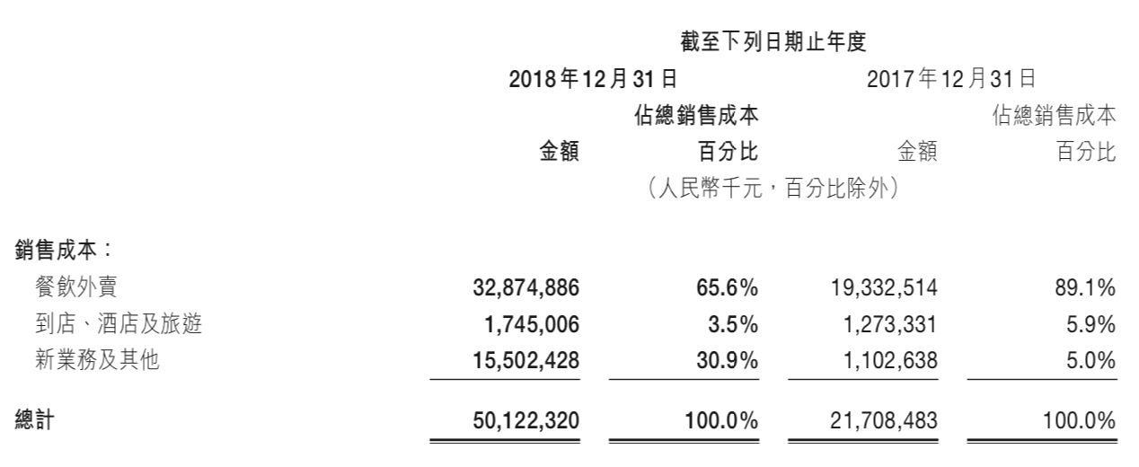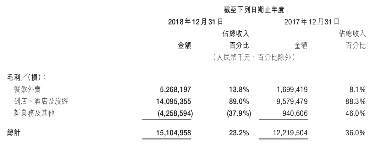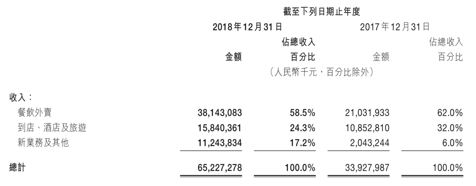 三大业务分部的收入在2018年都有明显增加,其中餐饮外卖收入增长81%,到店、酒店及旅游收入增长46%,而新业务及其他收入增长460%。