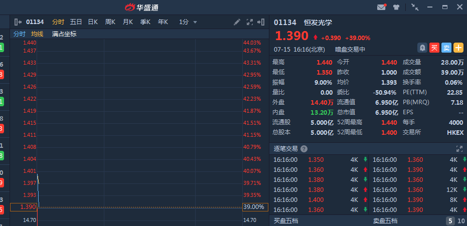 恒发光学(01134)暗盘高开40% ,截止发稿, 恒发光学暗盘段报1.39港元,较发行价1港元升39%,暂成交39万,最新总市值 6.95亿港元。