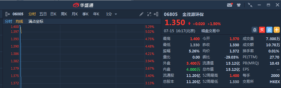 金茂源环保(06805)暗盘高开3%,截止发稿, 金茂源环保暗盘段报1.35港元,较发行价1.33港元升 1.50%,暂成交10.7万,最新总市值 15.12亿港元。