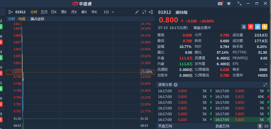 康特隆(01912)暗盘高开15.38%,截止发稿, 康特隆暗盘段报0.8港元,较发行价0.65港元升 23.08%,暂成交177万,最新总市值 6.4亿港元。