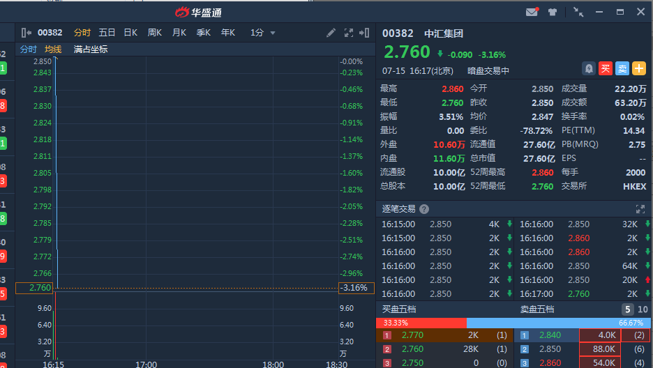 中汇集团(00382)暗盘平开,截止发稿,中汇集团暗盘段报2.76港元,较发行价2.85港元跌3.16 %,暂成交63.2万,最新总市值 27.6亿港元。