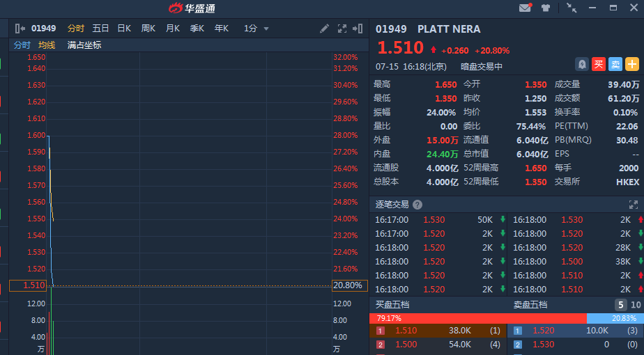 PLATT NERA(01949)暗盘高开8%,截止发稿,PLATT NERA暗盘段报1.51港元,较发行价1.25港元升 20.80%,暂成交61.2万,最新总市值 6.04亿港元。