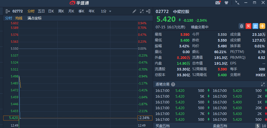中梁控股(02772)暗盘高开后转跌,截止发稿, 中梁控股暗盘段报5.42港元,较发行价5.55港元跌2.34%,暂成交127万,最新总市值191.3 亿港元。