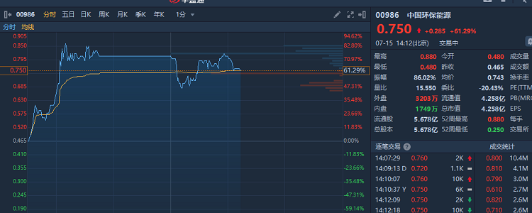 新浪港股讯 7月15日消息,中国环保能源一度暴涨近90%。且两次停牌,上午停牌前涨74%,报价0.81港元。下午复牌10多分钟,再度停牌,停牌前涨59%,报价0.74港元。公司从7月10日开始异动,7月10日以来分别涨15%、1.45%、32.86%、59%,四个交易日累计涨幅高达170%。市值从1.7亿一路涨到目前的4.2亿。