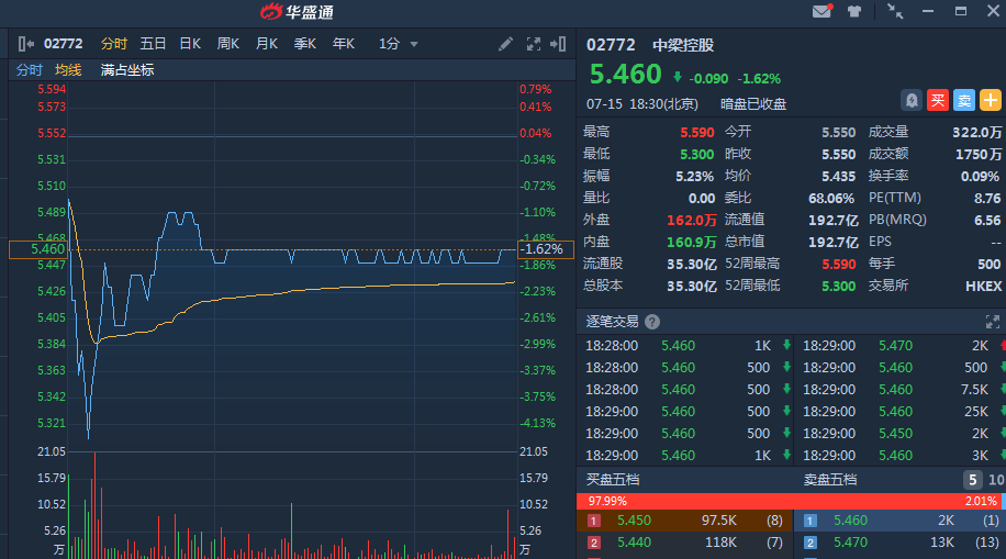 中梁控股(02772)今日暗盘收报5.46港元,较发行5.55价港元跌1.62%,每手蚀45港元,成交额1750万港元,总市值为192.7亿港元。