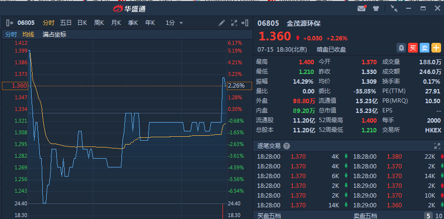 金茂源环保(06805)今日暗盘收报1.36港元,较发行价1.33港元涨2.26%,每手赚60港元,成交额246万港元,总市值为15.23亿港元。