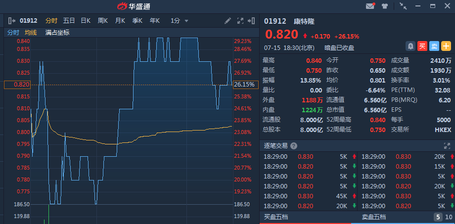 康特隆(01912)今日暗盘收报0.82港元,较发行价0.65港元涨26.15%,每手赚1000港元,成交额1930万港元,总市值为6.56亿港元。