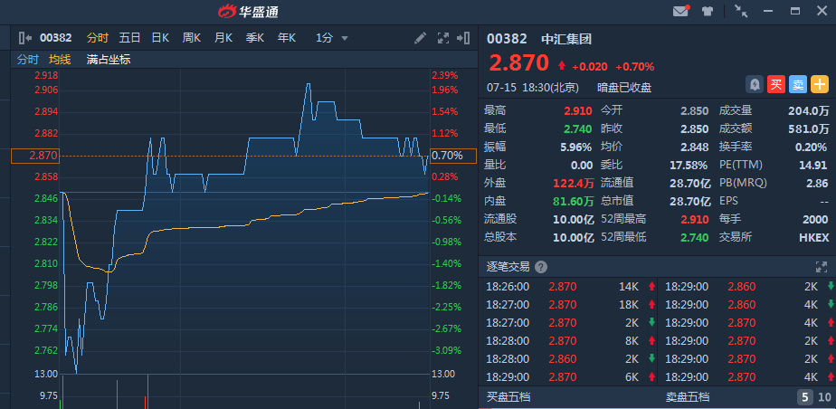 中汇集团(00382)今日暗盘收报2.87港元,较发行价2.848港元涨0.70%,每手赚44港元,成交额581万港元,总市值为28.7亿港元。