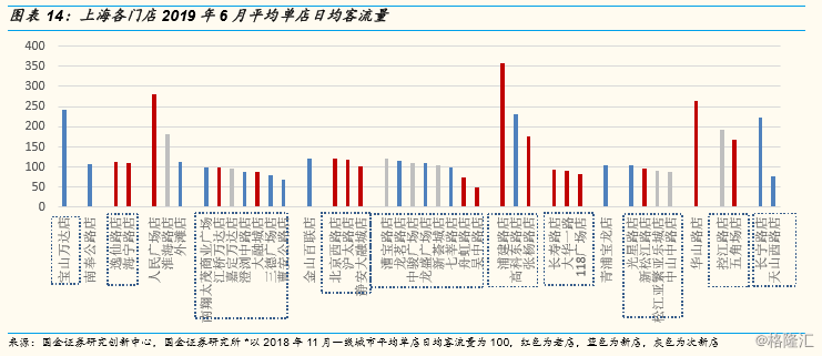 门店选址对客流量有直接的影响。虽然门店不断增加,但处于核心商圈的老店,如人民广场店、华山路店客流量水平整体很难撼动。