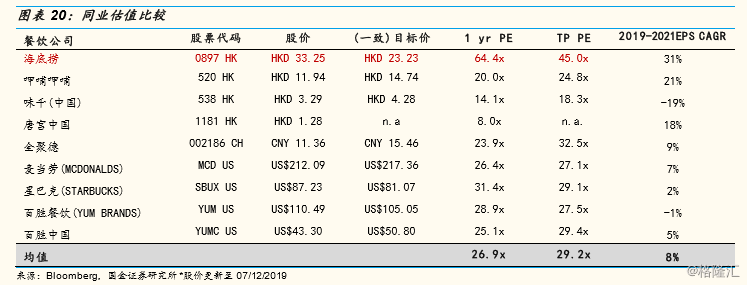 结合同业PE来看,我们认同短期门店增长的确定性以及餐饮品牌的强势影响力能给与海底捞一定估值溢价。但从目前市场一致预期测算,目前的股价隐含市场对公司未来三年50-60%的净利润复合增速预期(假设PEG=1),我们认为这个增速实现的概率不大。