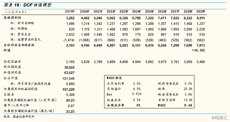 我们采用DCF估值法,以8.6%的WACC(公司经调整beta=0.9和3%的永续增长率为主要假设,即客单价每年保持3%的涨幅)。基于上述关键假设调整,我们预测19-21年收入端的复合增速为34%,EPS分别为人民币0.45/0.62/0.74元,下调幅度分别13%/14%/16%,同时提高了长期利润率假设,得出公司12个月的目标价为港币23.23元,相当于19-21年45x/33x/27x PE。
