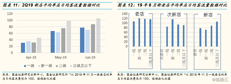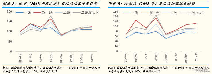 我们将18年之前开的门店定义为老店(按国金统计口径241家),2018年新开的门店定义为次新店(按国金统计口径172家),19年新开的门店定义为新店(按国金统计口径117家)。我们以2018年11月一线老店的单店日均客流量设为100, 经指数化处理,来观察19年上半年不同线城市老店、次新店的客流量变化。