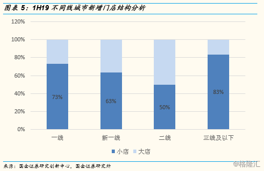 从不同城市的门店配置来看,今年上半年除了二线城市新店里小店、大店占比各一半外,其他城市均是小店占比居多。尤其是低线城市的新店中,小型门店超过8成。