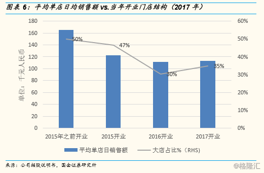 不同时间开业门店翻台率的比较,结合单店面积越开越小的趋势,总的来说,虽然门店在加速,但在总的营收规模和利润规模体量增速上,我们认为会比市场预期低。