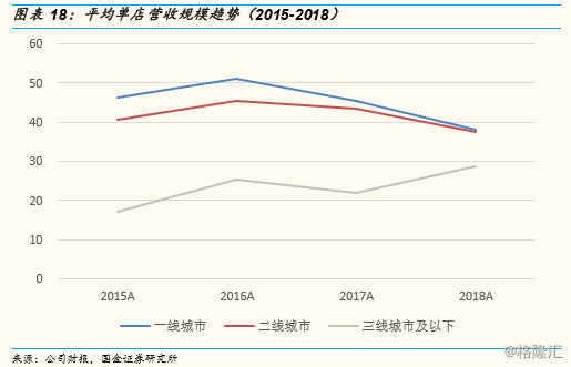 同时结合过年三年单店平均营收的趋势来看,由于门店面积变小以及新店营业时间稀释等因素,一、二线城市的单店收入规模呈下滑趋势,我们认为短期内平均单店营收下降的趋势将继续。