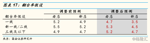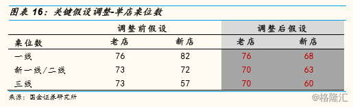 调整翻台率的预测。我们依然维持1000多家门店天花板的预测不变,但根据前文翻台率测算的结果略作调整,调低了一线城市门店的翻台率假设,但对一些门店数量尚处于安全区间的城市则结合门店大小趋势作相应调整。