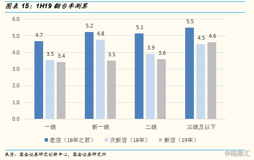 一线城市客流量出现分化。从我们跟踪的客流量数据来看,一线城市由于门店网络扩张明显,拉新的边际效应在降低,1H19期间单店客流量表现开始分化。处于核心商圈的老店凭借选址优势,翻台率长期处于高位;但在某些城市部分门店密度较高的区域中,已经出现老店客流量低于新店的情况。