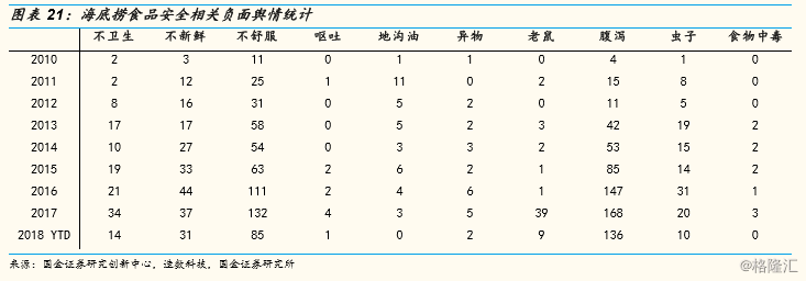 1)食品安全。对于所有的餐饮企业,食品安全都是主要的风险之一。海底捞所在的火锅行业,食用方式以短时间的煮涮为主,对于食材的品质和新鲜度的要求更高,面临的风险也越大。我们通过语义分析技术对海底捞顾客的舆情做了提取分析,可以看出与食品安全相关的负面点评在绝对数上呈现增长趋势。但是由于海底捞每年新增店面数和人流量近年来同步快速上升,2015-2017年整体的负面舆情占比均不超过0.15%。尽管海底捞一直重视食品安全并有完善的应对流程,一旦有较大规模的食品安全黑天鹅事件,对于公司的品牌和经营业绩均可能产生明显的冲击。